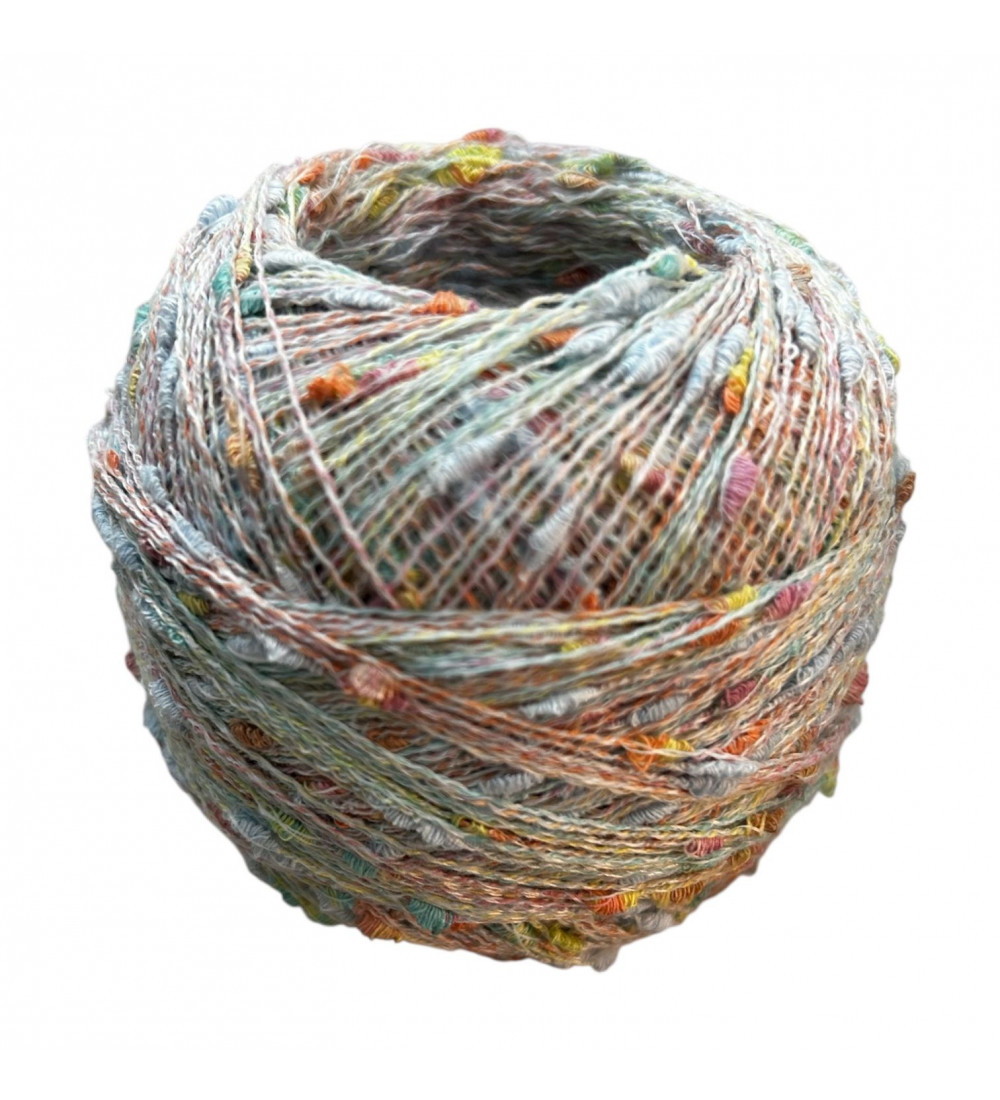 Nada más verlo entenderás su nombre: el “punto bodoque” hace referencia a un relieve con forma de pequeña esfera o bolita. Un hilado de textura irregular, muy en la línea del LINO FLAMÉ que tanto os gusta, pero reinterpretado en su versión de algodón. Su composición: 40 % de algodón reciclado, apostando por un tejer más consciente sin renunciar a la calidad ni al tacto; el 20 % de nylon es necesario para aportar la resistencia y consistencia necesarias para que el tejido resulte fluido y muy agradable.