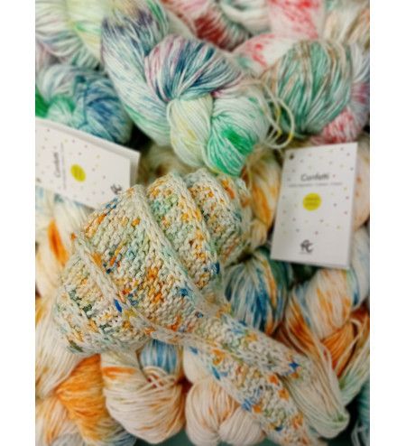 Se trata de madejas biodegradables y cada una de ellas recibe un baño de color diferente, por lo que su estampado siempre será irregular y exclusivo. En resumen, te enamorará a primera vista o primer toque.
