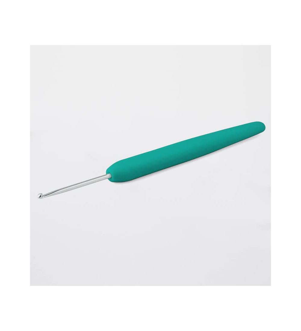 Con punta de aluminio y una capa deslizante que permite que los hilos y lanas se deslicen con mucha suavidad. Mango de silicona suave y resistente, ergonómico.