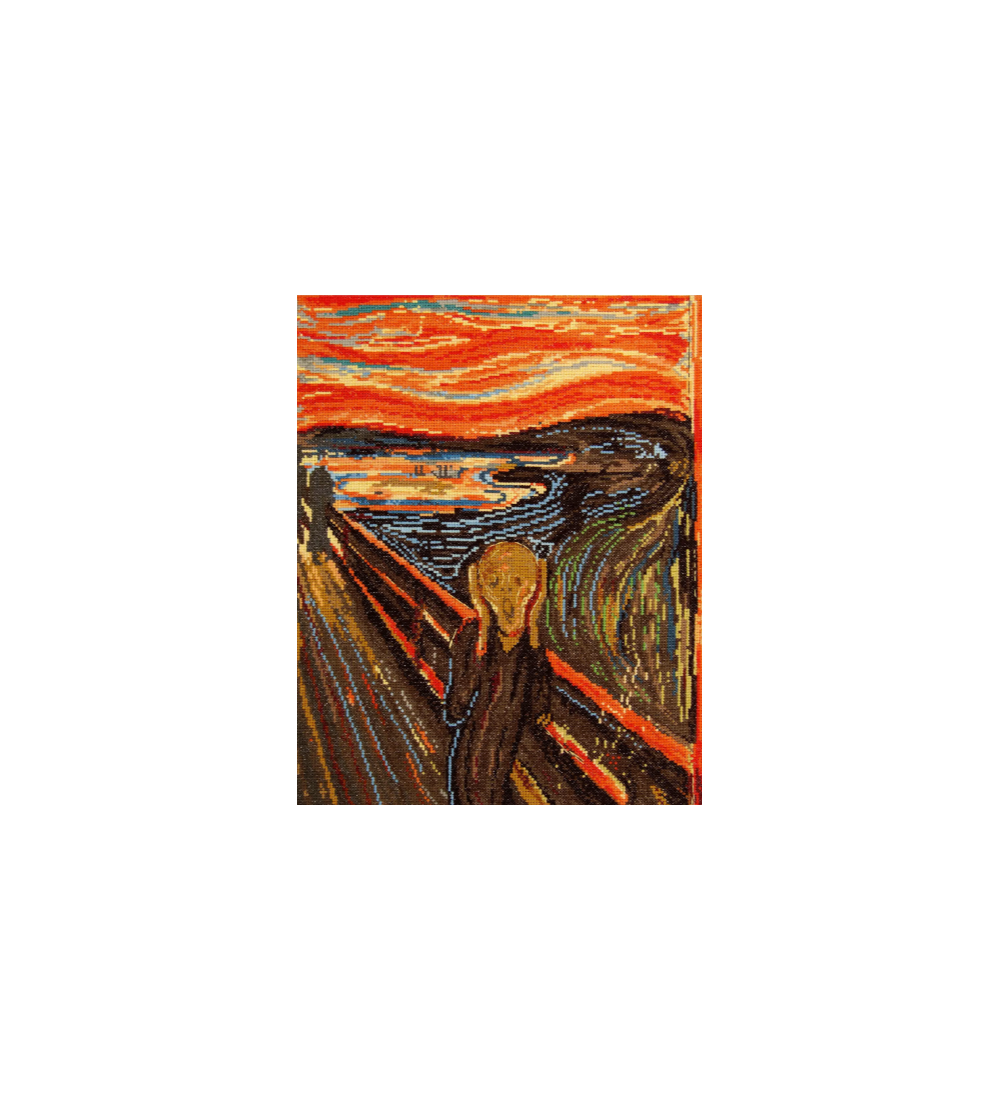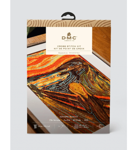Este kit contiene todo lo necesario para recrear la obra maestra de Munch en punto de cruz. Incluye hilos Mouliné Spécial en un organizador, tela aida de 5,5 pts/cm, una aguja e instrucciones fáciles de seguir.