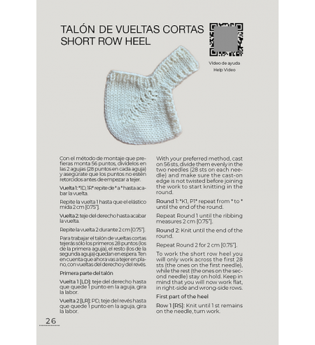Está estructurado en una primera parte técnica que explica desde los materiales para tejer calcetines, como tomar medidas y calcular punteras y talos y como montar puntos desde la caña, desde la puntera y cómo tejer talones afterthought, de vueltas cortas y de solapa, tanto de la puntera a la caña como de la caña a la puntera, y en todas las “lecciones” hay un código QR, que te lleva a un video en el que se explica detalladamente la lección. El libro contiene más de 2 horas de tutoriales en video.