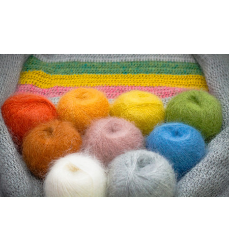 Esta mezcla garantiza que un 70% es mohair de la mejor calidad, super Kid Mohair, un hilado de alta gama, a un precio muy competitivo al presentarse en ovillos de 50 gramos y 450 metros. Un ovillo te da para tejer un chal.