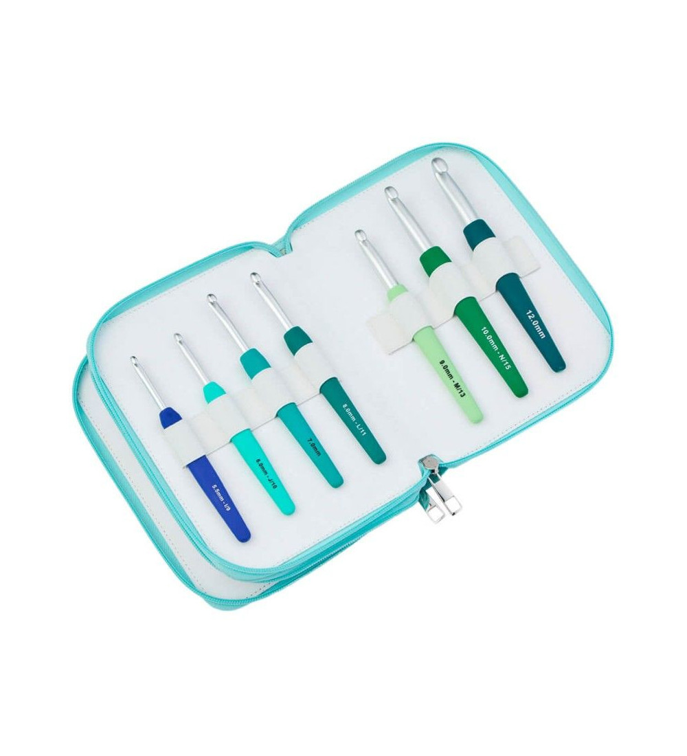 Un estuche de color verde agua muy completo con ganchillos desde 2mm hasta el 12mm: 2; 2,5; 3; 3,5; 4; 4,5; 5; 5,5; 6; 7; 8; 9; 10 y 12.