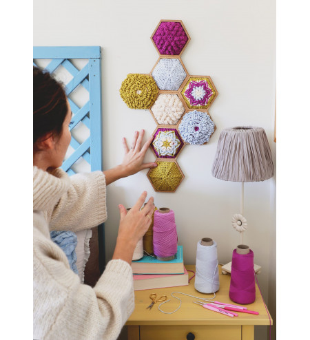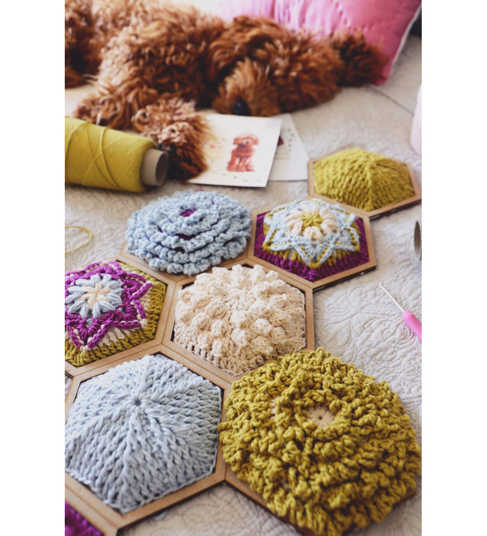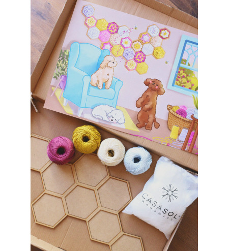 El kit incluye: 1 honey de 8 hexágonos de madera (base y marco), 4 ovillos de algodón L peinado L de 70 gramos cada uno (malva, pistacho, natural y celeste - los colores no se pueden elegir), relleno de 100 gramos, tarjeta para descarga del patrón y acceso al CAL con Laura @susimiu (el CAL será en noviembre 2023), lámina impresa en cartulina brillante mate de alta calidad de 60x40cm, a todo color, diseñada exclusivamente para este producto por la ilustradora @paloma.liranzo.